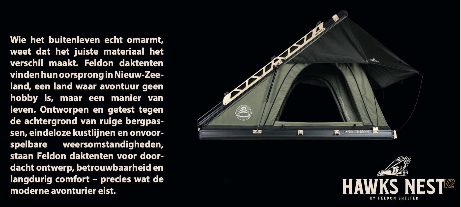Gedreven door een gedeelde passie voor ontdekken en het buiten‐ leven zorgen MenKnow Adventures en Overland N’ Explore ervoor dat Feldon niet alleen staat voor innovatie, maar ook voor lokale kennis, service en ondersteuning. Het resultaat is een merk dat zo‐ wel wereldwijd als persoonlijk aanvoelt – ontwikkeld in Nieuw‐Zeel‐ and, getest in Europa en volledig ondersteund in Nederland.